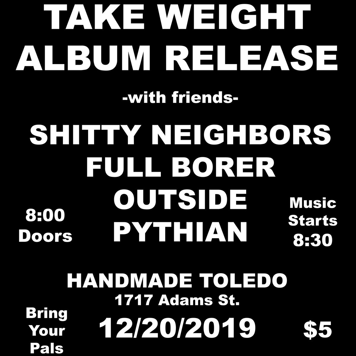 Can it ever be enough? Can’t we ever just cut up these problems, shape, devour or solve them? This life has a shovel and we’re dodging soil, running around holes to bury us alive. Duck. Fake. Take cover. Think of what you love. Don’t stay. Take Weight! Accelerate, change lanes. Don’t wait to break. Remember to escape your head, go camp or on the porch with friends, let’s crack a beer and go outside!